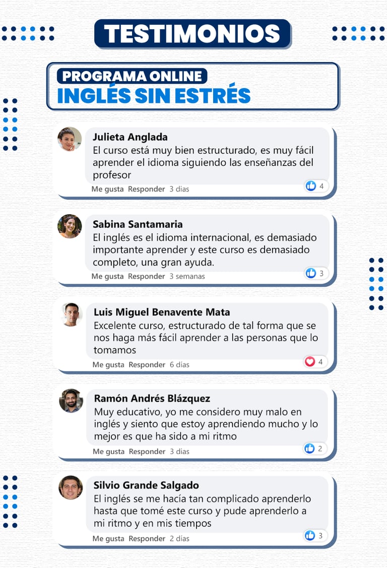 Más de 500 alumnos han completado este curso y destacan la claridad, la paciencia y el método único de Lynn. Sus experiencias reales confirman que “Inglés sin Estrés” es un programa efectivo, accesible y pensado para ayudarte a lograr resultados desde las primeras clases.